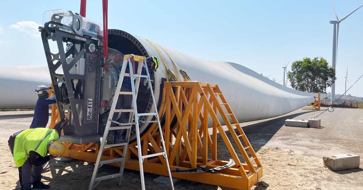 CNC Onsite diseñó una máquina adaptada para perforar el laminado de las palas, logrando hacer orificios con dimensiones precisas para los nuevos bujes. Soren Kellenberger, de CNC Onsite, menciona que “perforar en fibra de vidrio es exigente para las herramientas, por lo que desarrollamos brocas especiales para lograr precisión y eficiencia”.