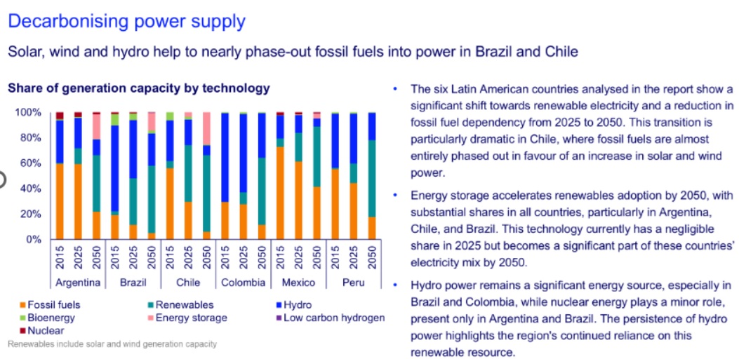 Aunque los combustibles fósiles continúan siendo relevantes en el mix energético, estos países han comenzado a tomar medidas para disminuir su dependencia. Brasil lidera este esfuerzo, previendo reducir su uso al 49% para 2050, mientras que México, a pesar de grandes avances, seguirá dependiendo fuertemente de estos combustibles, con una modesta caída de su participación del 95% al 86% en el mismo horizonte.