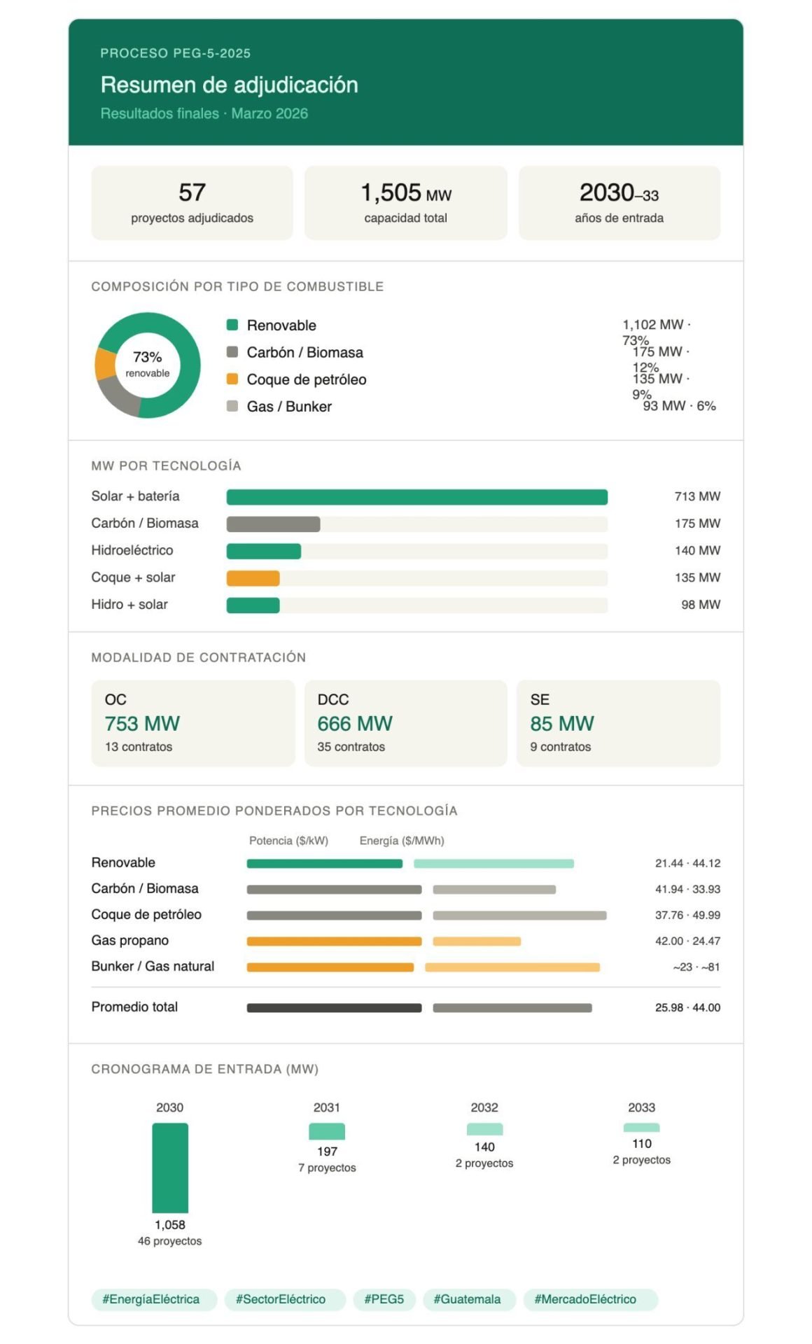La subasta PEG-5-2025 en Guatemala ha marcado un hito en la evolución del sistema energético del país, adjudicando un total de 1.505 MW de capacidad de generación. De este total, un destacado 73% se ha destinado a tecnologías renovables, lo que indica un cambio significativo hacia fuentes de energía más limpias.