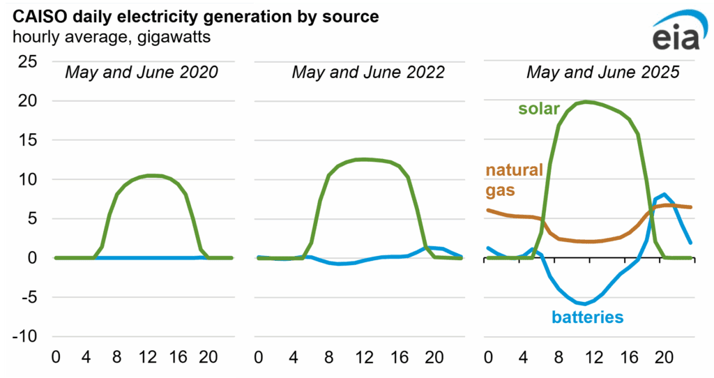 - La generación de electricidad a partir del gas natural en California sigue cayendo, mientras que la producción de energía solar y de baterías se expande, según datos recientes de la Administración de Información Energética de EE.