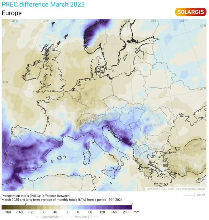 Además de los datos de GHI, los patrones de precipitación también han mostrado desviaciones interesantes respecto a las normativas históricas. En marzo, España y Noruega registraron hasta 200 mm por encima de lo habitual, mientras que el Reino Unido y parte de Alemania vieron cifras hasta 140 mm por debajo de la media. Mayo se presentó particularmente seco en el noroeste de Europa, con reducciones de hasta 80 mm en Reino Unido, Francia y Alemania.